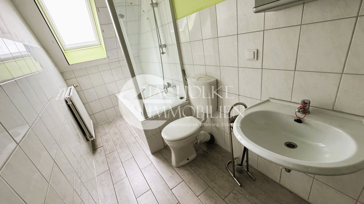 -Die Sanitäranlagen sind einfach ausgestattet und sollten im Rahmen einer Modernisierung erneuert werden.