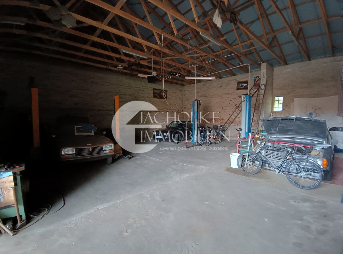 Die Innenausstattung umfasst Dielen, Fliesen, Teppichböden, Parkett und Betonböden. Eine Einbauküche ist ebenfalls vorhanden. Die vielen Garagen und Abstellmöglichkeiten bieten ausreichend Stauraum für Fahrzeuge und Gerätschaften.
